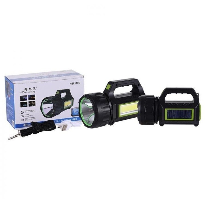 Descriere Lanterna cu acumulator si incarcare solara este achizitia care nu ar trebui sa lipseasca din nicio locuinta, fiind ideala pentru orice imprejurare si foarte usor de utilizat. Aceasta este perfecta pentru uz profesional, camping, pescuit, uz casnic, mecanici, instalatori, etc. Caracteristici: Model: HEL-T95 Putere: 10W Luminozitate: 600lm Port USB Panou solar Baterie incorporata Capacitate acumulator: 20000mAh Tip bec: LED, COB Culoare: 6000k Raza iluminare: pana la 500m Timp de operare: pana la 15h Mod de iluminare: maxima 10W, minima 5W, stroboscop, lateral Usor de utilizat Poate fi purtata pe umar Material: ABS Dimensiuni (L x l): 20 x 11 cm Diametru: 9.5 cm Pachetul include: 1 x Lanterna de mana 1 x Cablu USB 1 x Curea Art.: MRKT10514 Specificatii Caracteristici generale Utilizare In mana Tip bec LED Caracteristici tehnice Tip alimentare Solara