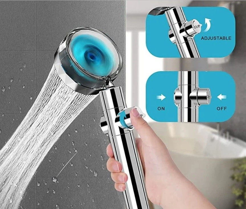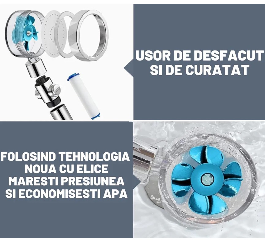 - Creste presiunea apei: Tehnologia unica de elice inclusa si duzele fine de evacuare ajuta la cresterea presiunii cu pana la 50% fata de o para normala in timp ce consumul de apa se reduce cu pana la 30%.