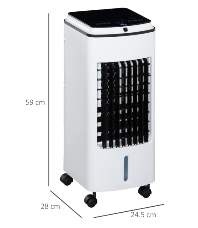 DIMENSIUNI: Dimensiuni generale: 24.5L x 28l x 59Icm. Tava pentru gheata: 4L. Suprafata acoperita: 15-25m2. Putere: 75W. Se cere asamblare.